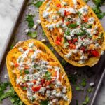 - Fill the squash shells: Spoon the buffalo chicken mixture back into the spaghetti squash shells, dividing evenly among the two halves.