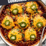 - Top Chili with Cornbread: Drop the batter in 6-8 mounds evenly over the chili in the skillet. Place a jalapeno slice on each mound if desired for extra heat and flavor.