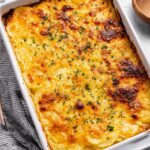 Classic Au Gratin Potatoes made with thinly sliced Yukon Gold potatoes layered with onions and baked in a rich and creamy cheese sauce featuring cheddar, gruyere, and parmesan cheeses. This comforting side dish is perfect for holiday dinners or any special occasion.