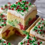 - Decorate and Serve: Just before serving, sprinkle with red and green sprinkles or decorations for a festive touch. Slice and enjoy your Christmas Poke Cake!