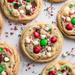 Santa's Favorite Cookies are soft and pillowy brown sugar pudding cookies filled with festive Christmas M&Ms and colorful sprinkles. These easy-to-make cookies have a delightful texture and perfect sweetness, making them a holiday favorite.