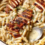 - Combine Pasta and Chicken: Stir the cooked pasta and sliced or chopped chicken into the sauce, or serve the chicken on top of the pasta if preferred. Add some reserved pasta water a little at a time to adjust the sauce consistency if needed. Season with additional salt and freshly cracked pepper to taste.