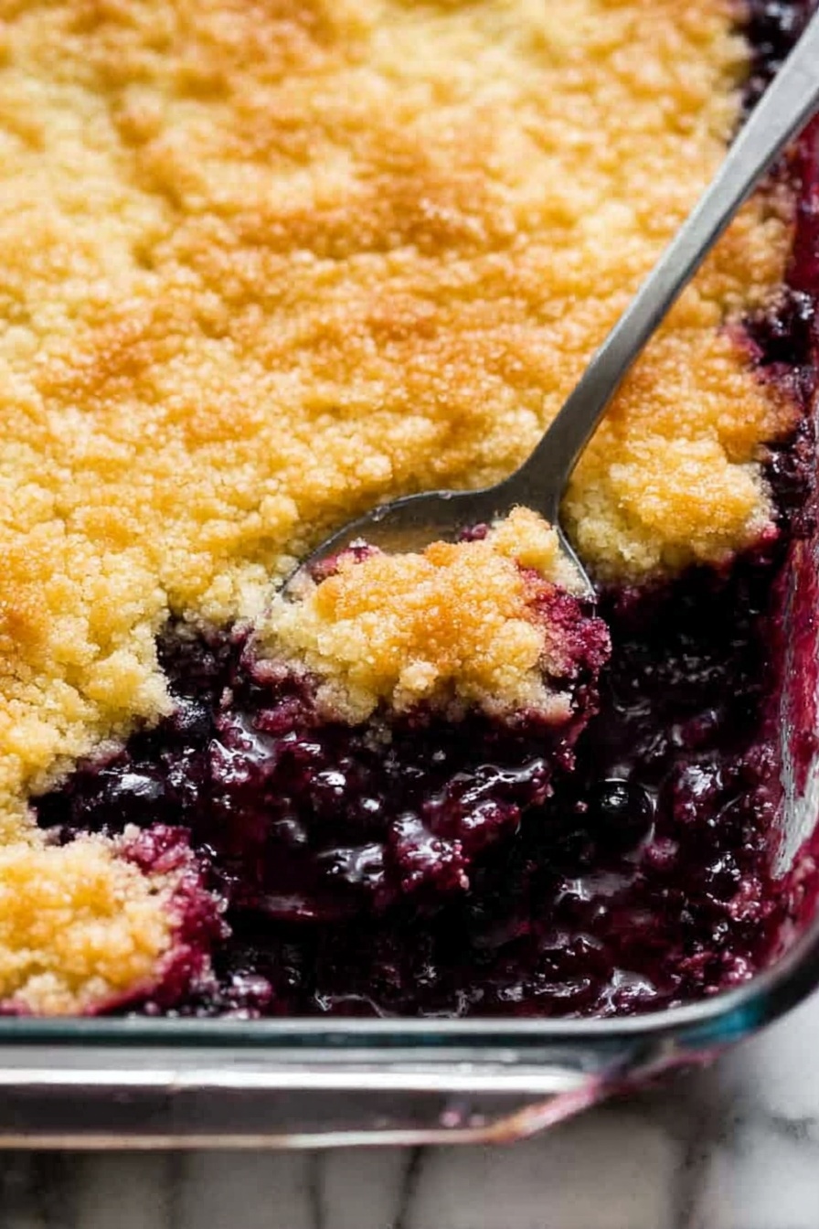 Pour the blueberry mixture right over the melted butter in the pan. Then, spoon or drizzle the batter evenly over the berries. Finally, sprinkle a light dusting of ground cinnamon on top for that warm cozy note. Bake it in your 350°F oven for about 35-40 minutes until the top turns lightly golden and the berries are bubbling around the edges — that’s your cue it’s done.