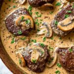 This Steak Diane recipe features tender filet mignon steaks seared to perfection and served with a rich, velvety pan sauce made from caramelized cremini mushrooms, shallots, garlic, and a blend of savory seasonings. The sauce, finished with heavy cream and fresh parsley, perfectly complements the steaks and pairs beautifully with mashed potatoes for an elevated, restaurant-quality dinner at home.