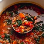 A hearty and healthy Mediterranean Lentil Soup packed with plant-based protein and vibrant flavors. This cozy vegetarian soup combines fire-roasted tomatoes, green lentils, and fresh kale with aromatic spices and bright lemon juice, perfect for warming up on chilly days.