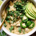 A thick and hearty Slow Cooker Chicken Chile Verde Stew with potatoes, featuring tender chicken thighs, vibrant salsa verde, and comforting red potatoes, perfect for meal preps or freezing for later.