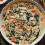 This comforting Sausage White Bean Soup combines spicy Italian sausage, creamy cannellini beans, fresh spinach, and carrots simmered in a flavorful broth enriched with cream and herbs. It's a hearty, one-pot meal perfect for chilly evenings or anytime you crave a cozy, veggie-packed dish.