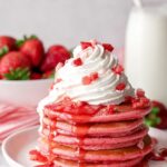 These Strawberry Pancakes are a delightful twist on classic pancakes, featuring freeze-dried strawberry powder for natural fruit flavor and a lovely pink hue. Perfect for breakfast or brunch, they are fluffy, sweet, and topped with whipped cream, fresh strawberries, and syrup for an irresistible treat.