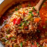 Hearty and comforting Stuffed Pepper Soup featuring ground beef, onions, bell peppers, tomatoes, and rice in a flavorful tomato broth, perfect for a cozy one-pot dinner.