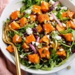 - Assemble salad: In a large bowl, combine the roasted sweet potatoes with baby arugula, sliced shallot, dried cranberries, pepitas, feta or goat cheese if using, and 6 tablespoons of dressing. Toss gently to combine.