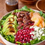 - Add toppings: Top the greens with the orange segments, avocado slices, pomegranate seeds, 1 cup crumbled feta cheese, and 1 cup candied spiced nuts or your preferred toasted nuts.